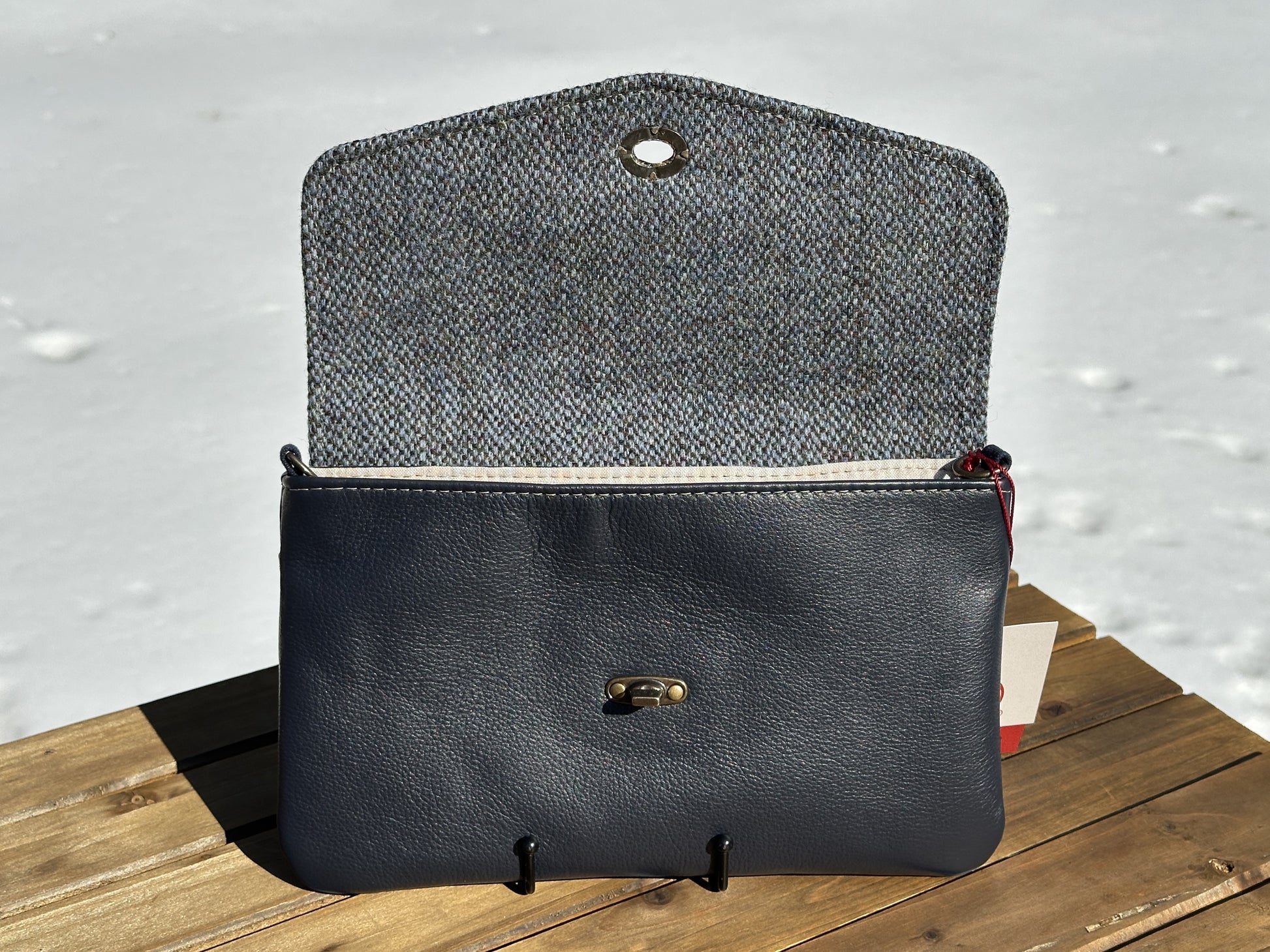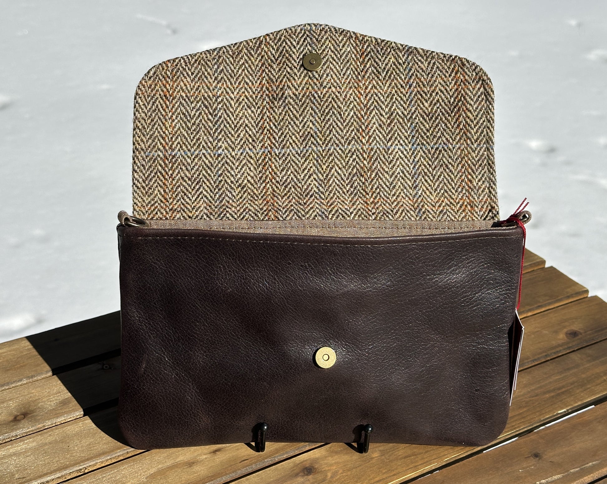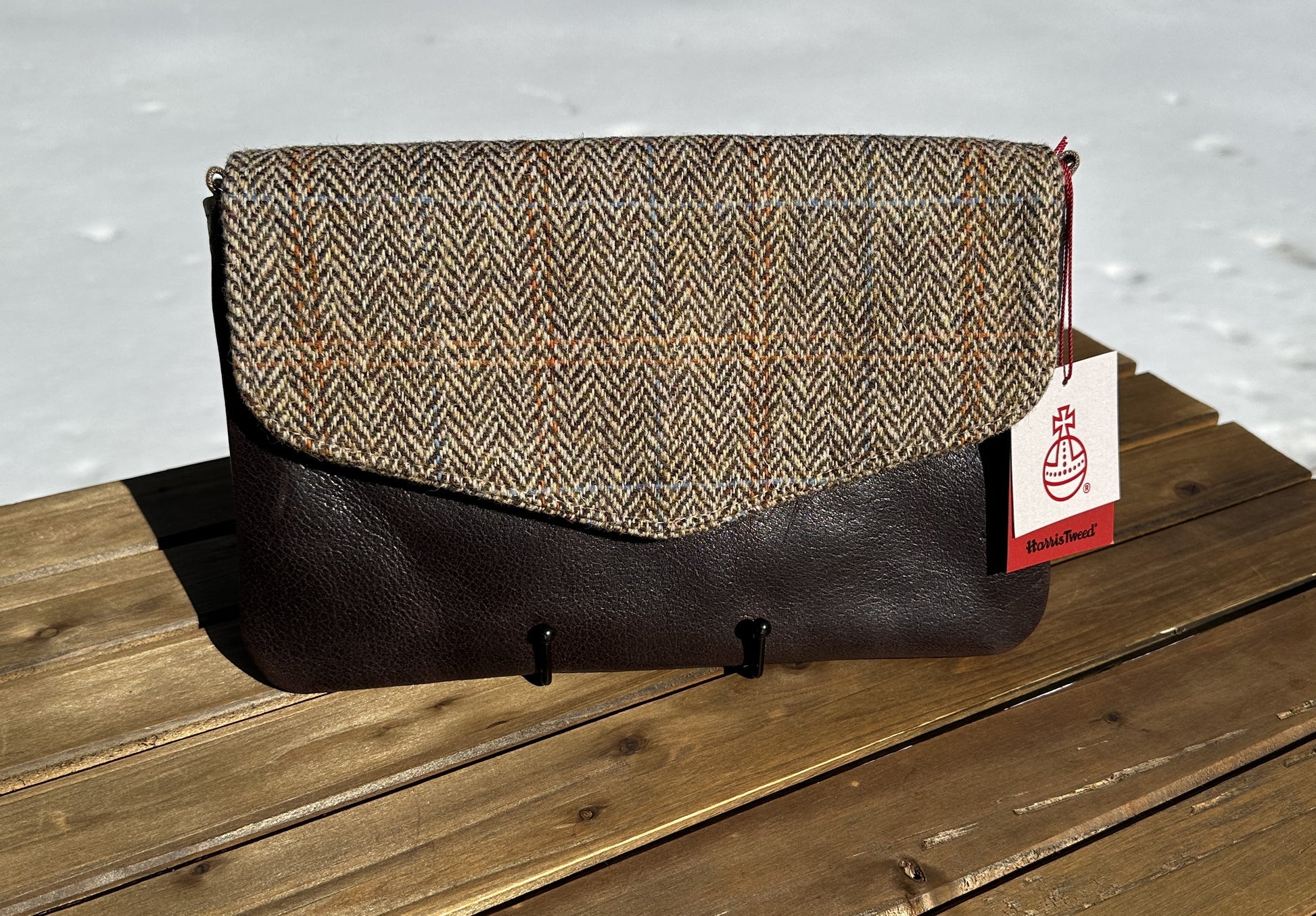 Inspired by the clean lines of a timeless envelope clutch, the Cove blends structure and softness into a silhouette that feels effortlessly elegant. The sleek leather body is paired with a beautifully tailored flap of authentic Harris Tweed®, creating a refined contrast of texture and heritage craftsmanship that never goes out of style.