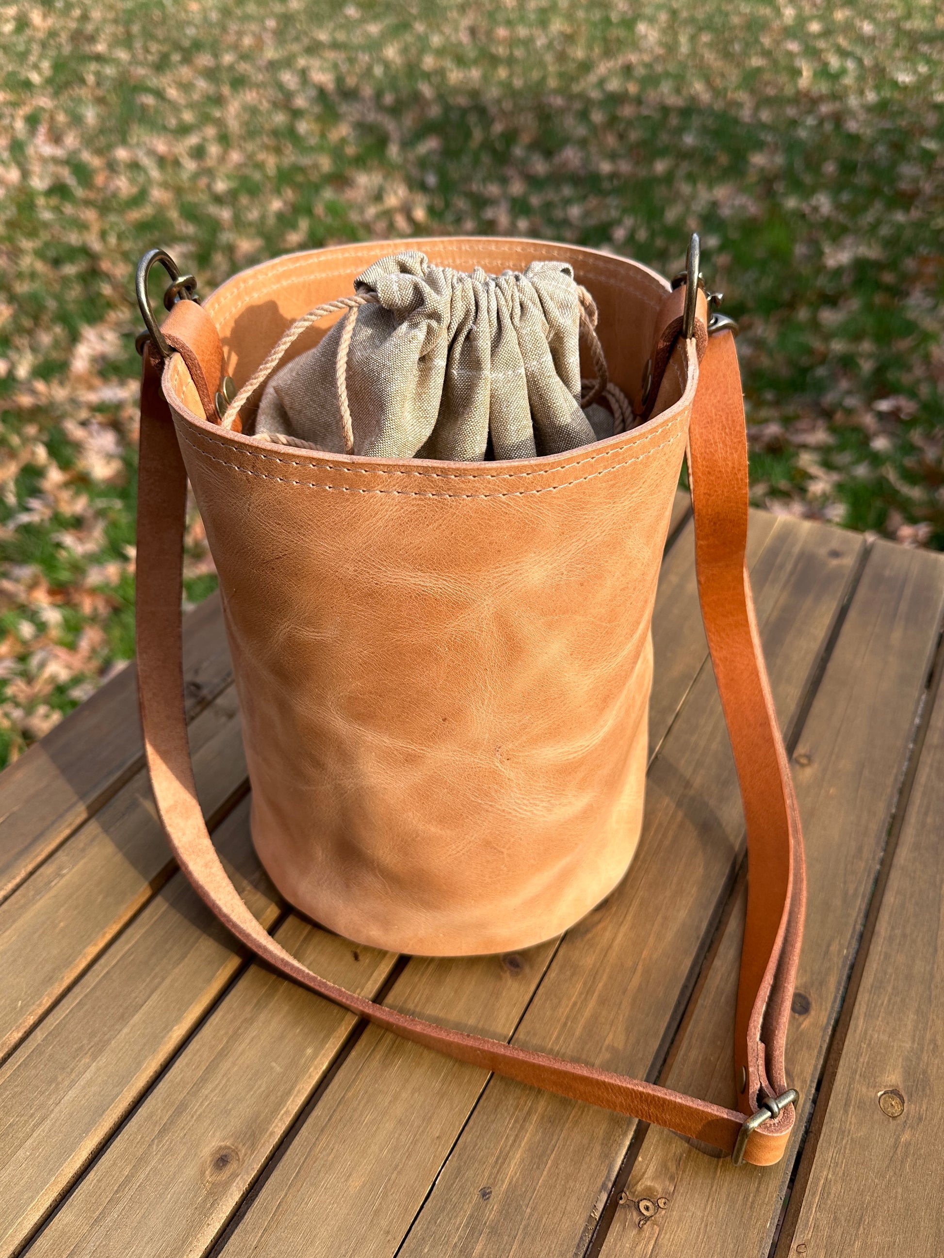 The interior is lined with natural canvas and features two slip pockets to keep your essentials organized. It closes securely with a magnetic snap—no zippers to snag your yarn. The adjustable leather strap allows for comfortable shoulder or crossbody wear, making it ideal for creative outings or everyday style.
