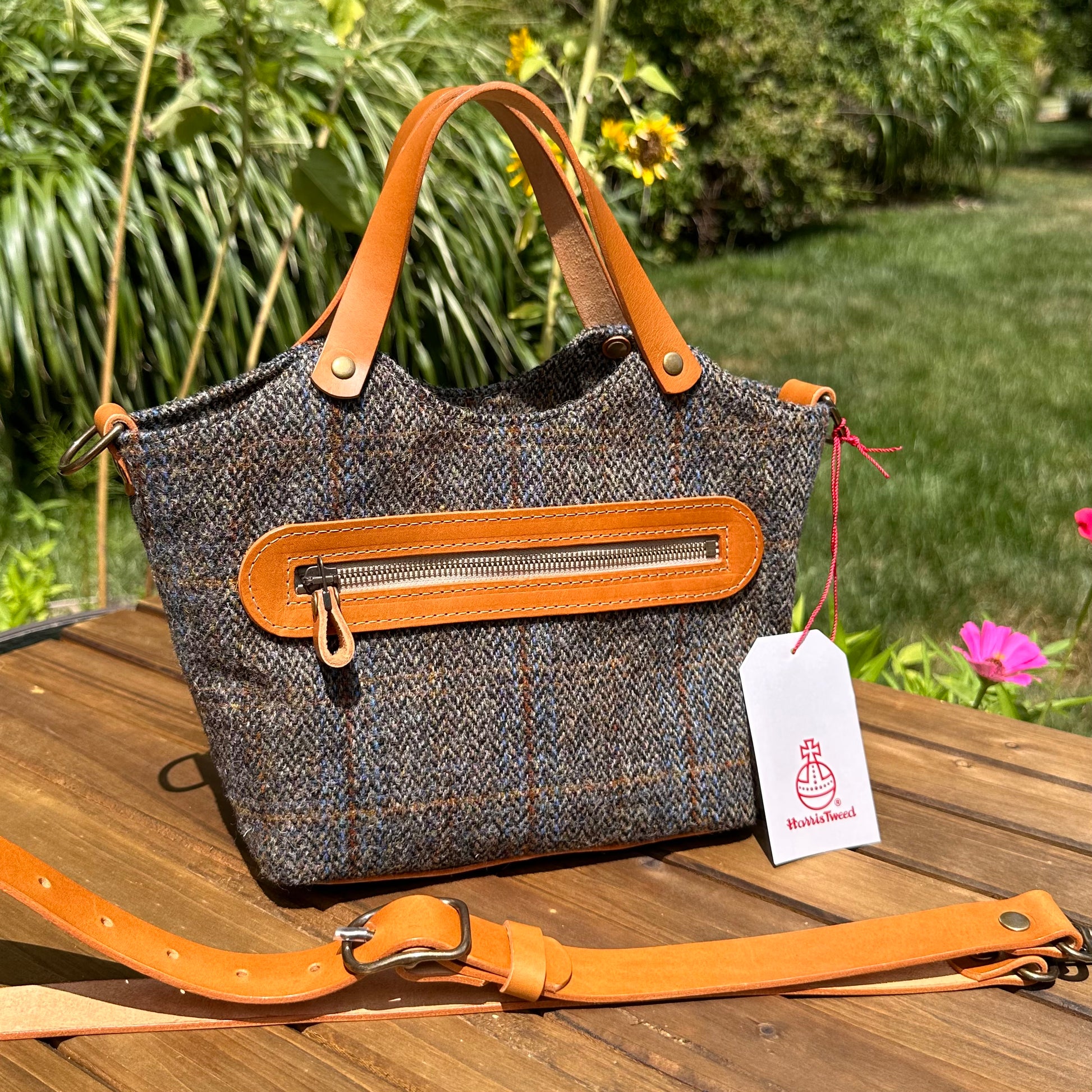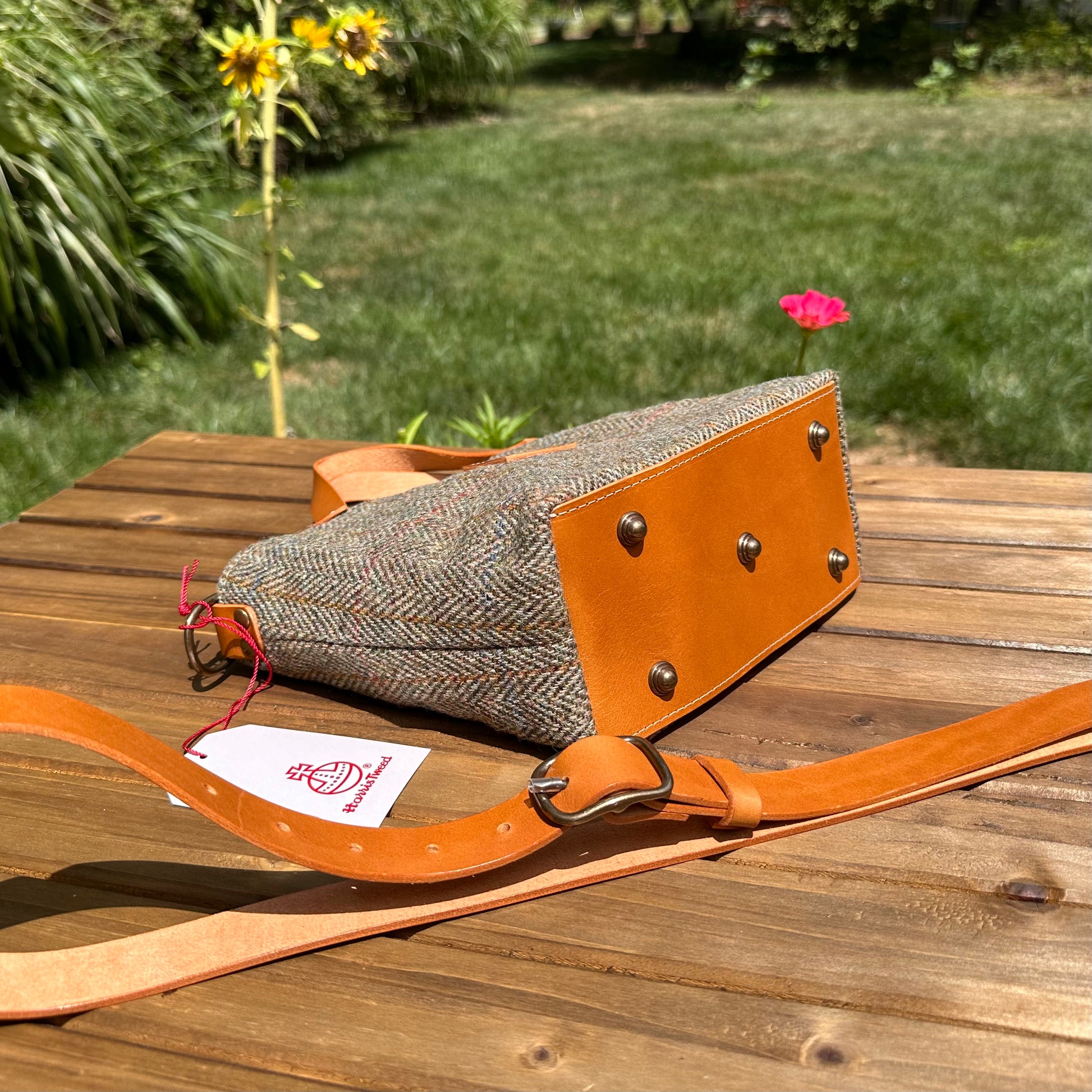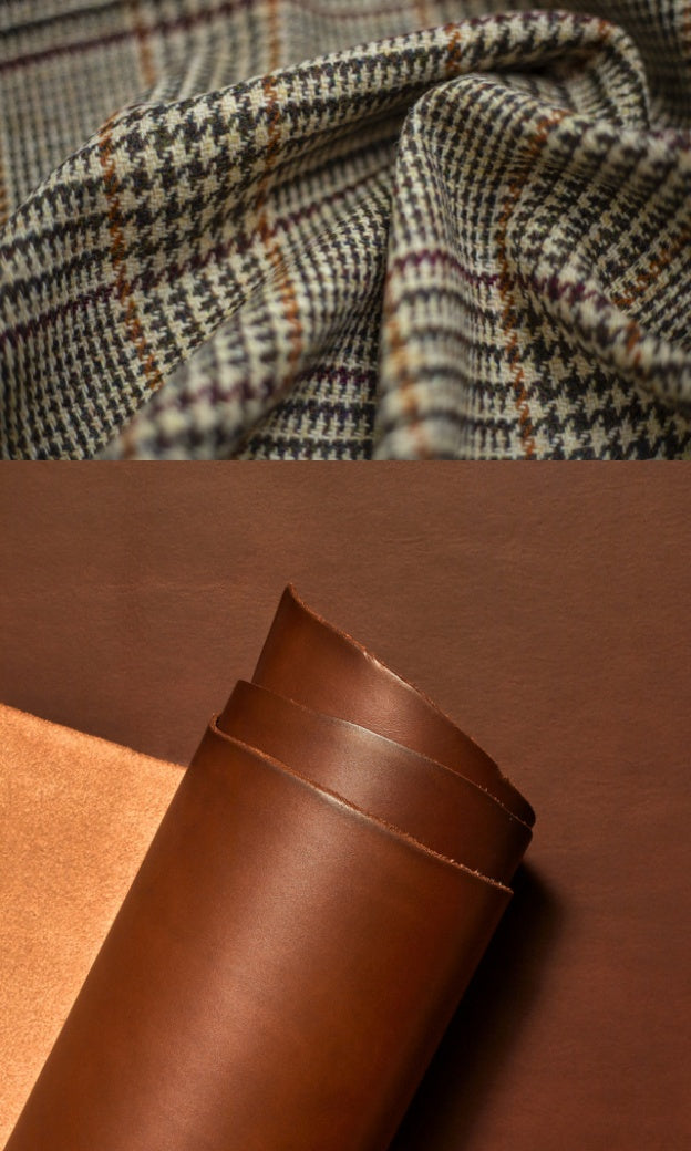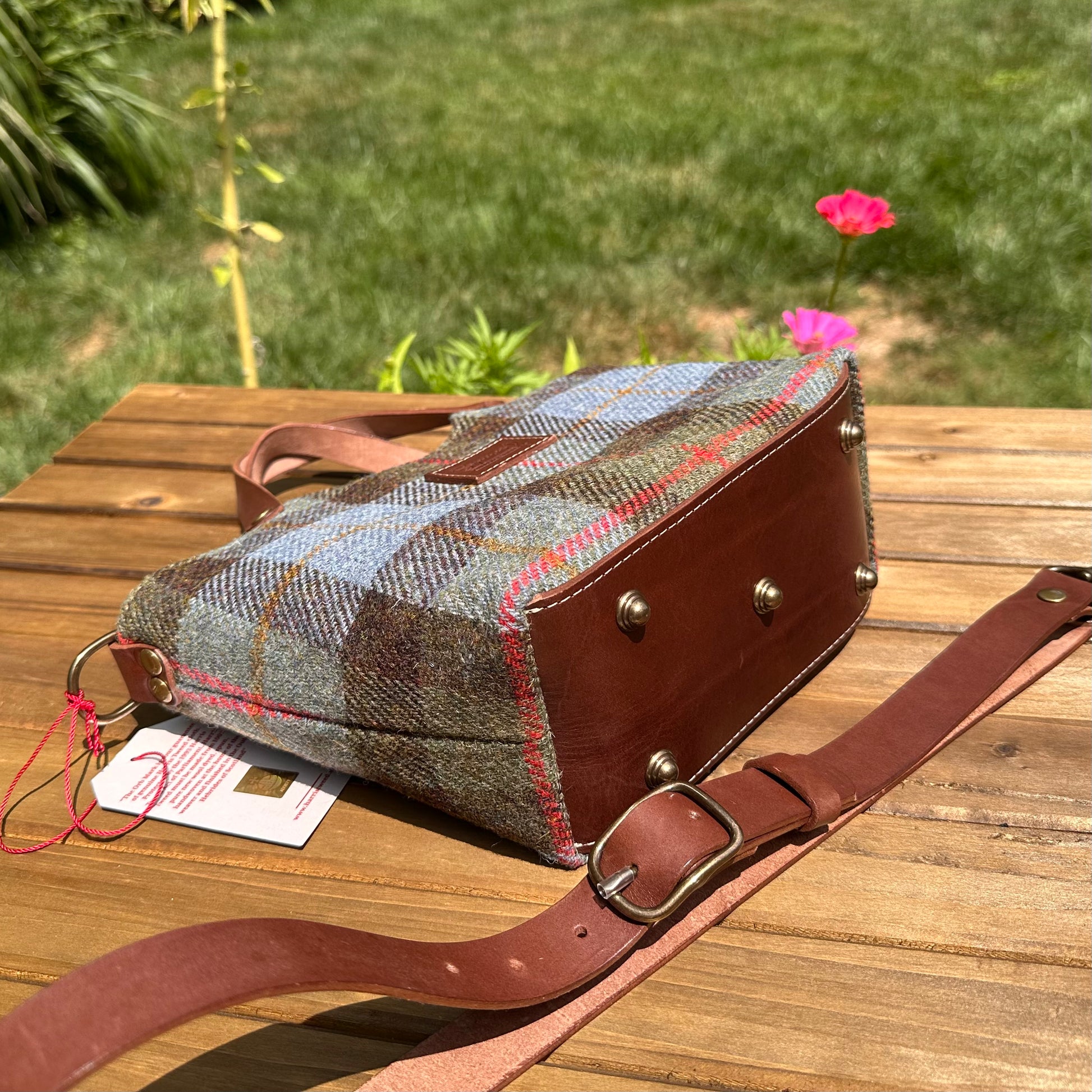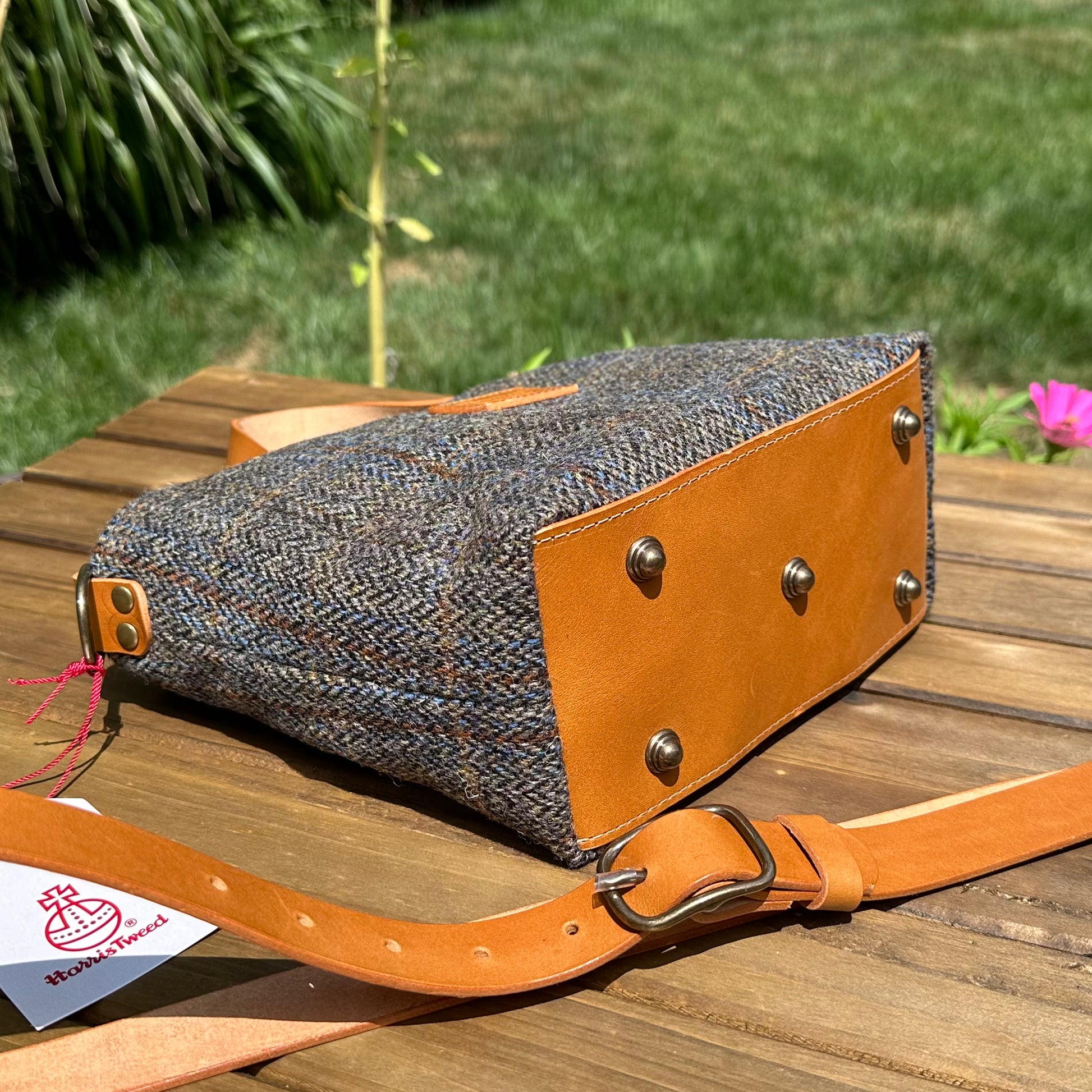 The Mazie Handbag features an exterior crafted from luxurious Harris Tweed®, renowned for its heritage, quality, and timeless appeal. Each handbag is complemented by Full Grain 'Valdibrana' Italian Vachetta leather and solid brass hardware, adding a touch of refined sophistication. The interior lining options include high-quality canvas or linen, providing both durability and a soft, luxurious feel.