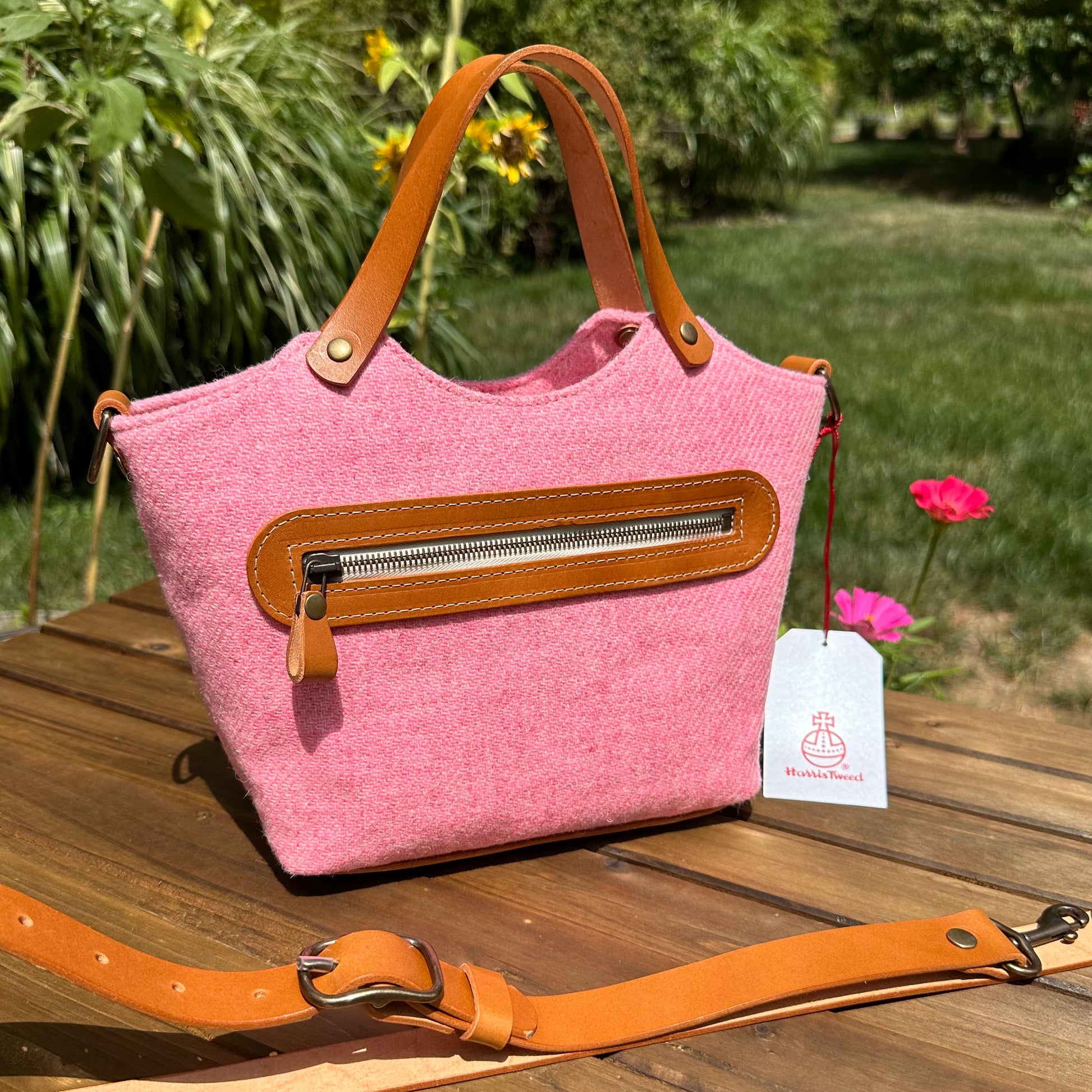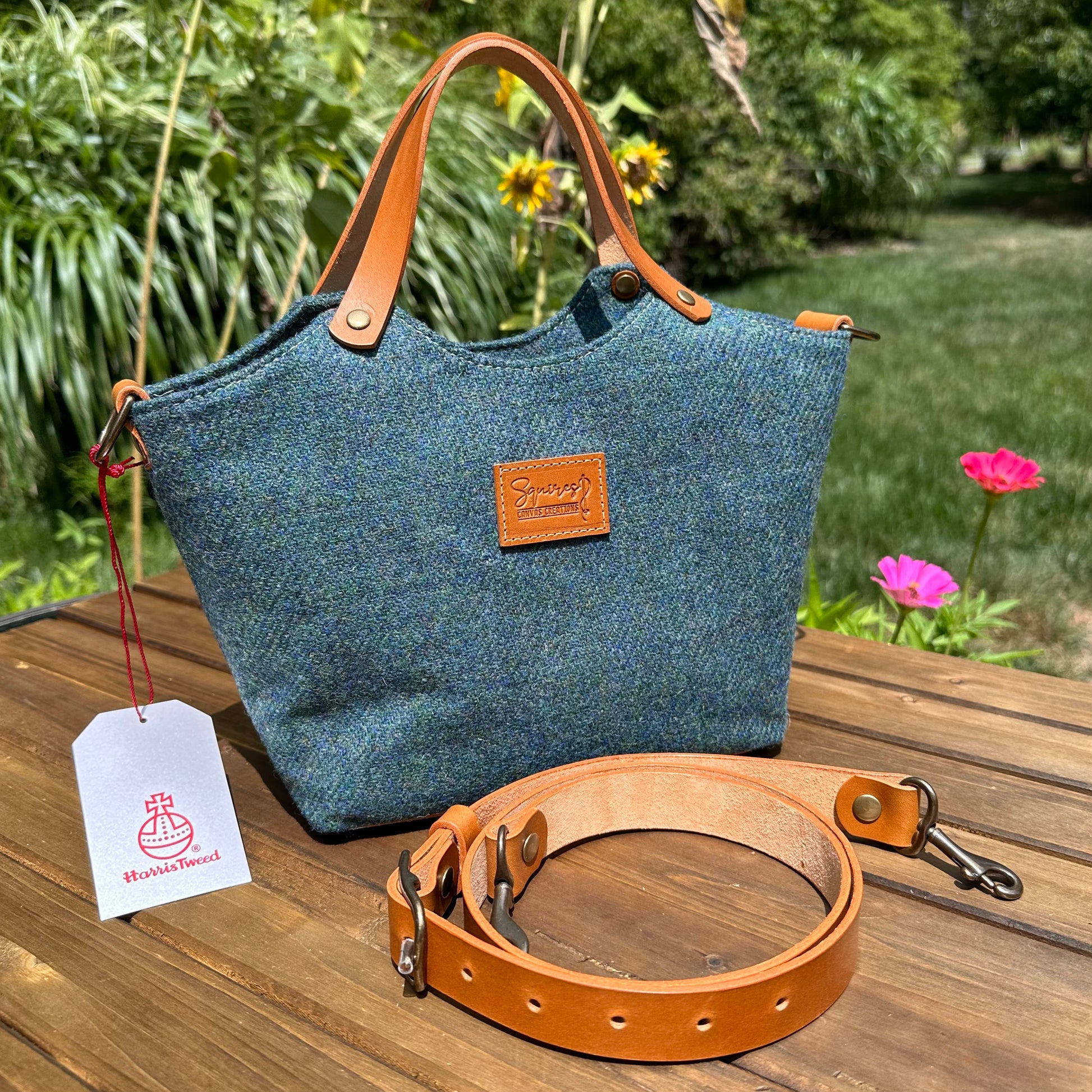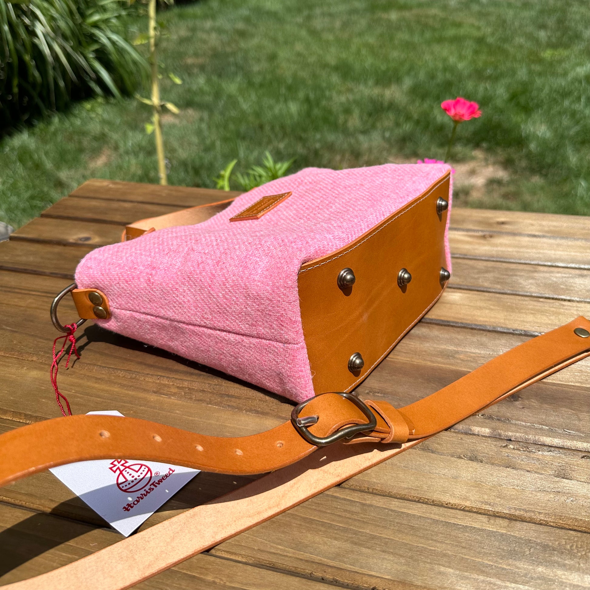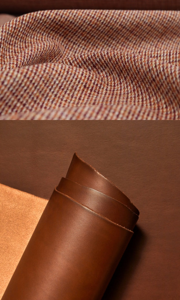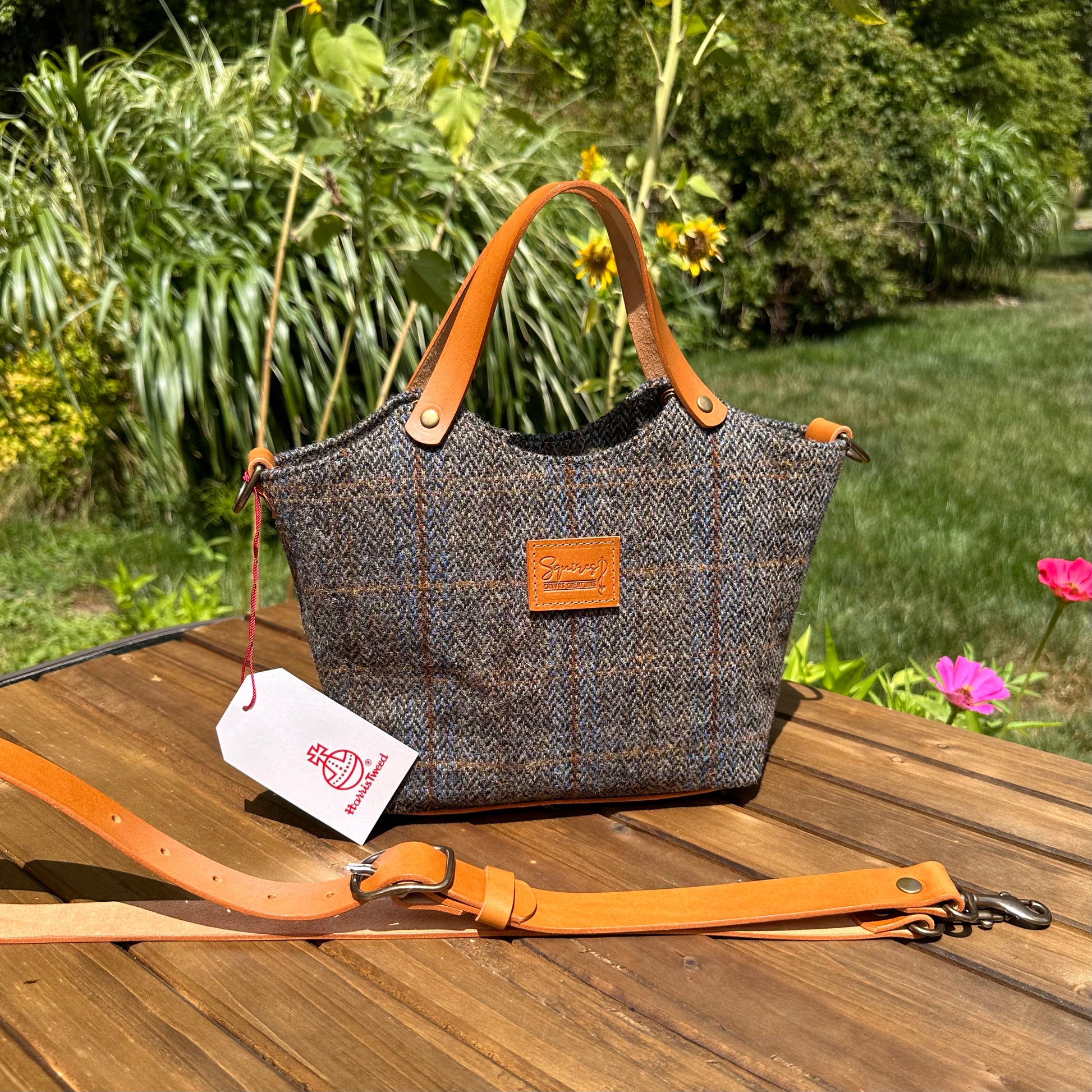 The Mazie Handbag features an exterior crafted from luxurious Harris Tweed®, renowned for its heritage, quality, and timeless appeal. Each handbag is complemented by Full Grain 'Valdibrana' Italian Vachetta leather and solid brass hardware, adding a touch of refined sophistication. The interior lining options include high-quality canvas or linen, providing both durability and a soft, luxurious feel.