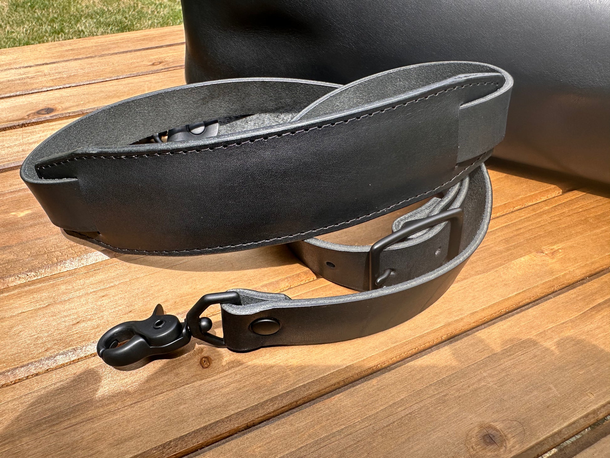 - 1.5" wide Horween Full Grain Veg Tan Leather Adjustable Strap or 1" Buckle Strap with Shoulder Pad