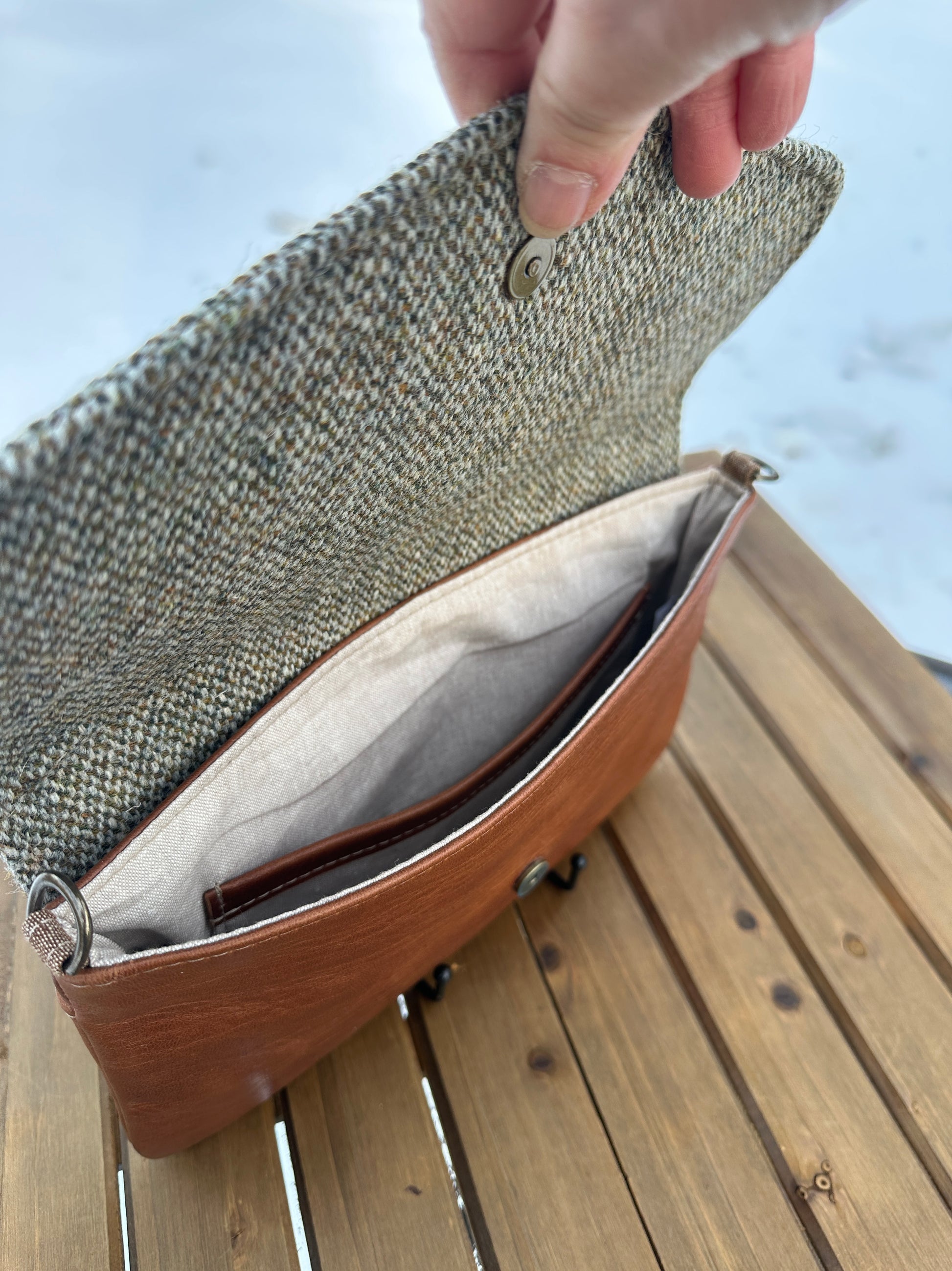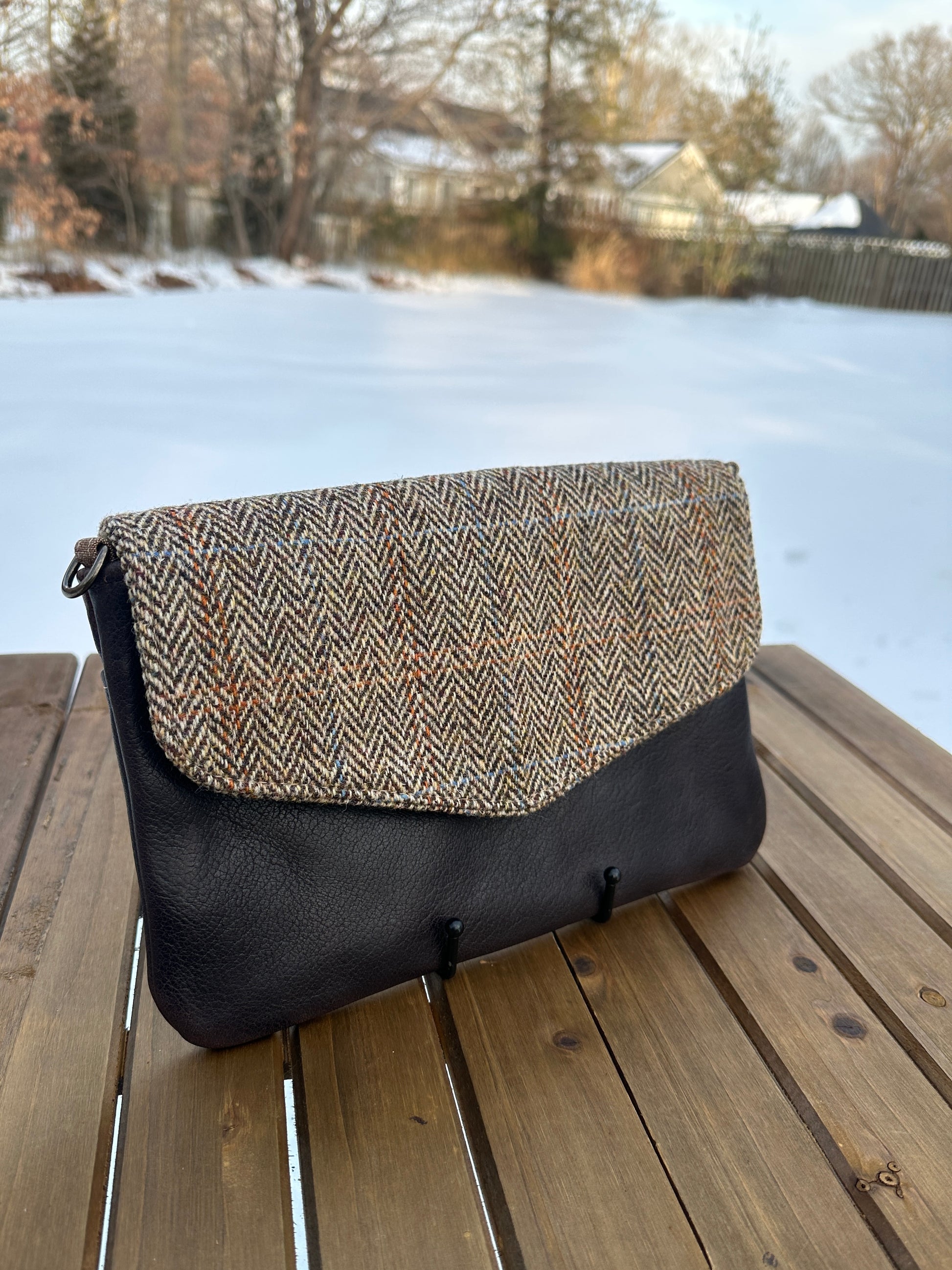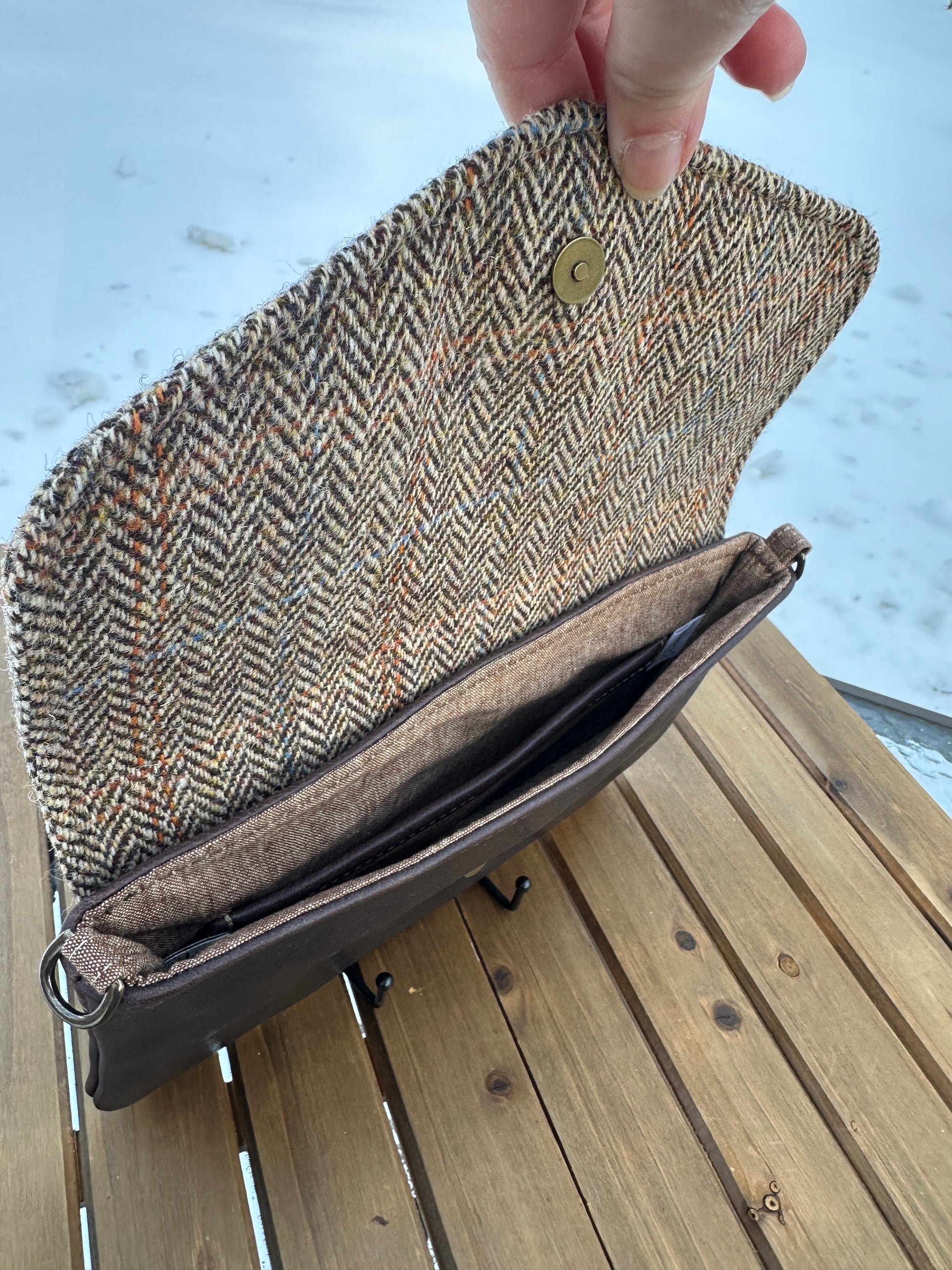 Inspired by the clean lines of a timeless envelope clutch, the Skye Fold blends structure and softness into a silhouette that feels effortlessly elegant. The sleek leather body is paired with a beautifully tailored flap of authentic Harris Tweed®, creating a refined contrast of texture and heritage craftsmanship that never goes out of style.