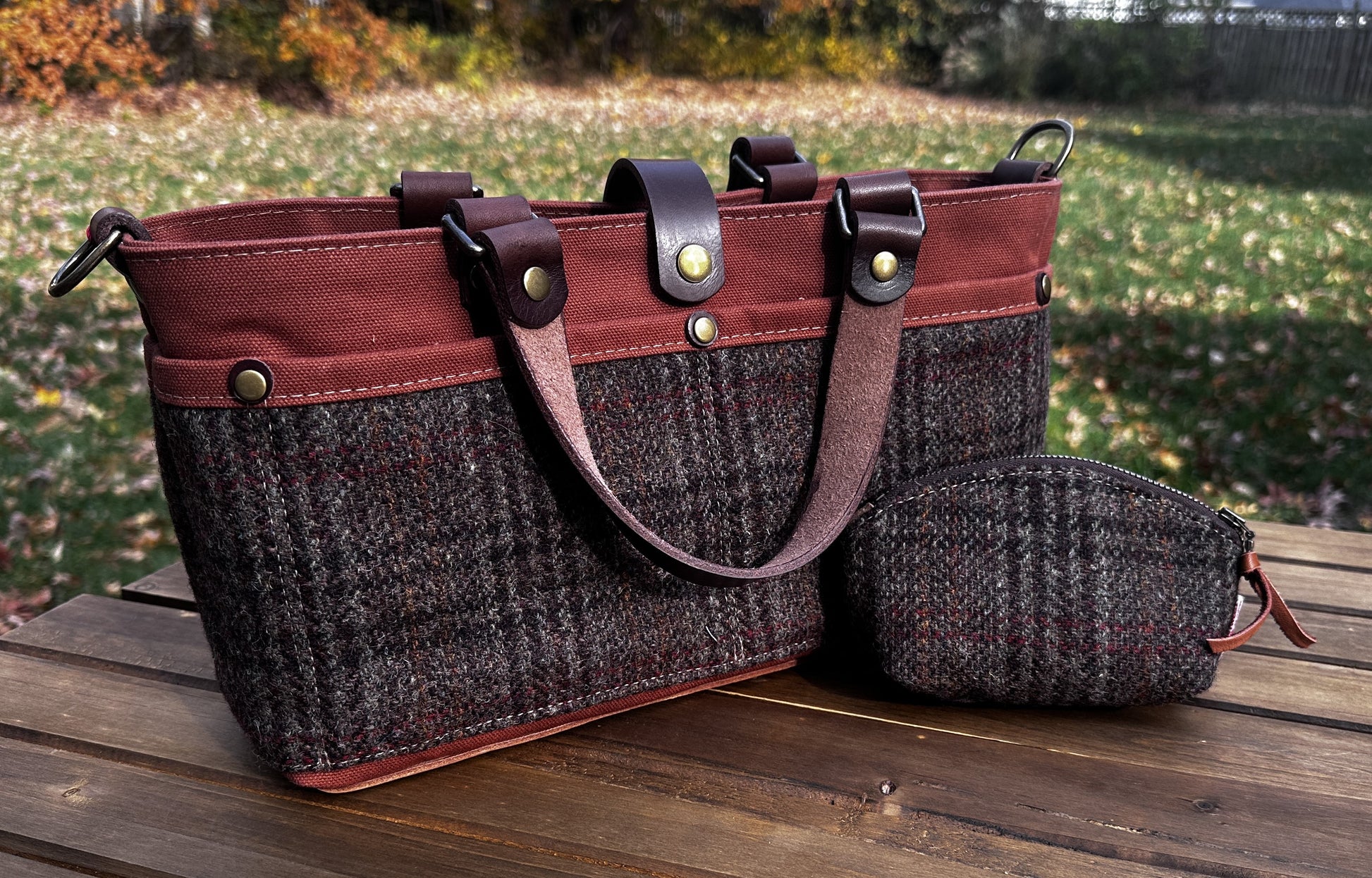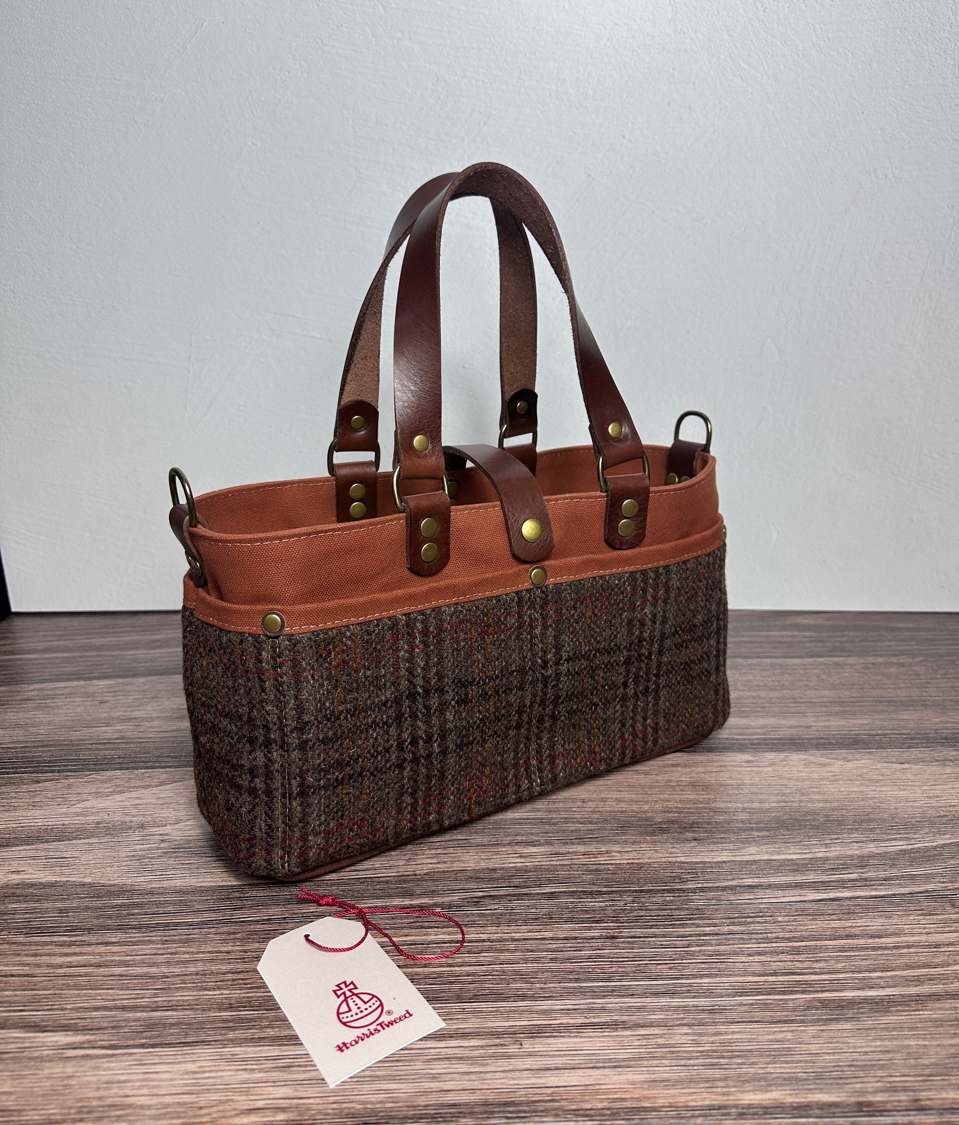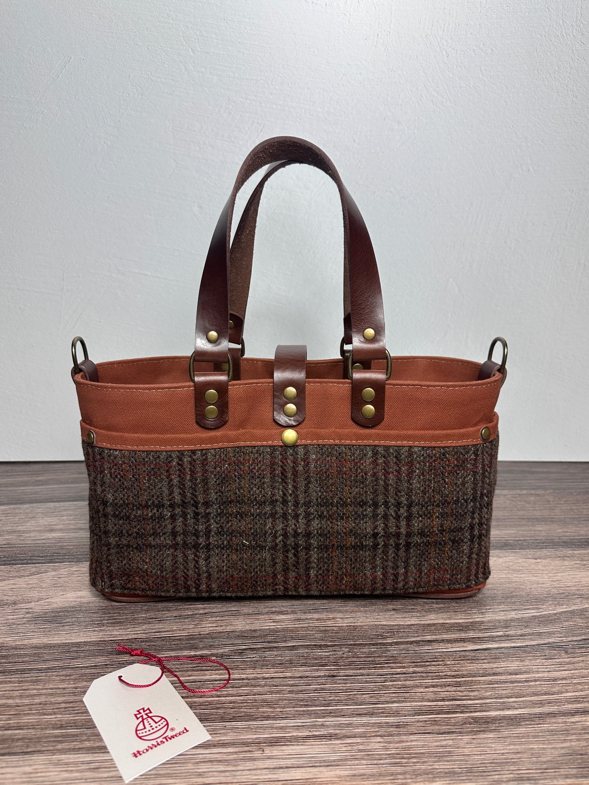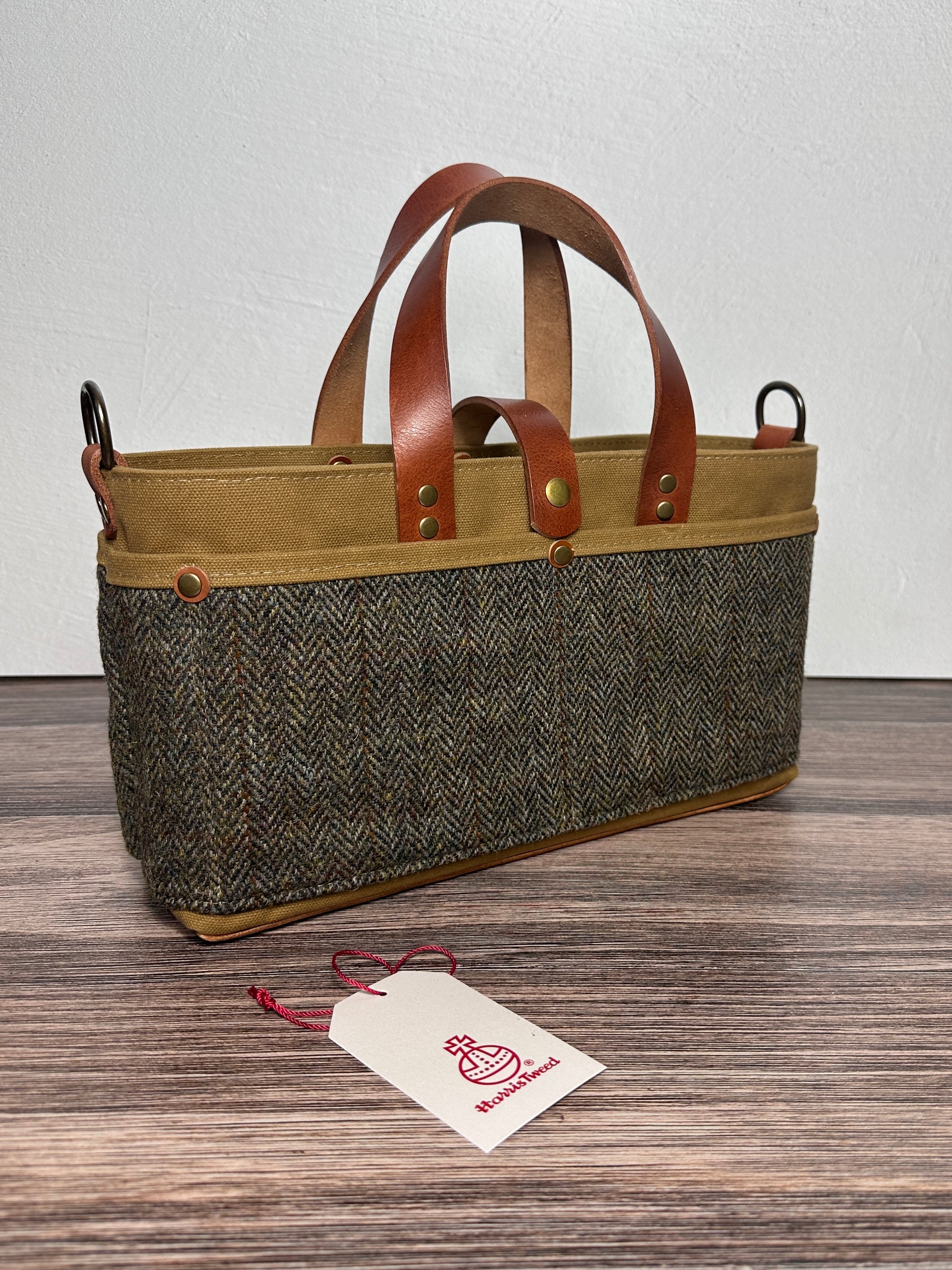 The St. Andrews Tote combines the timeless elegance of authentic Harris Tweed® with durable Halley Stevensons Hybrid Waxed Canvas combined with Veg Tan Leather handles and base add a touch of charm and character. The St Andrews Tote is a beautifully structured everyday tote with a spacious interior and 7 exterior pockets. The St Andrews is designed for those who appreciate both style & functionality while being the perfect companion for your projects. This thoughtfully designed tote is built to hold all your project essential with enough exterior pockets to help keep you organized. Knitters and fiber arts makers can keep your skeins available for easy access and keep your tools organized and right at hand while adding a touch of classic tweed to your crafting experience.
